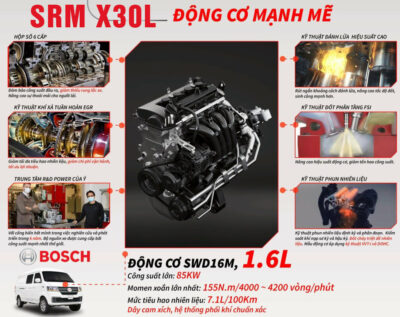 Dòng xe tải nhẹ SRM X30L 945kg phiên bản 2 chỗ ngồi được trang bị khối động cơ công nghệ Đức SWD16M, dung tích 1.6L, xăng không chì, 04 kỳ, 04 xy lanh thẳng hàng, làm mát bằng nước, tiêu chuẩn khí thải Euro 5. Van SRM X30L còn được trang bị thêm hệ thống phun nhiên liệu điện tử, giúp xe tiết kiệm nhiên liệu hiệu quả hơn. Công suất 85 kW tại vòng tua máy 5.600 vòng/phút.